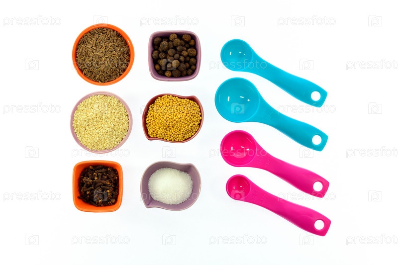 Семена, специи, зерна в небольших разноцветных чашках