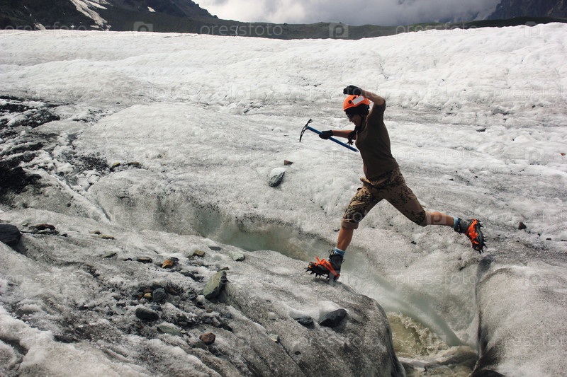 Девушка прыгает через трещину в леднике