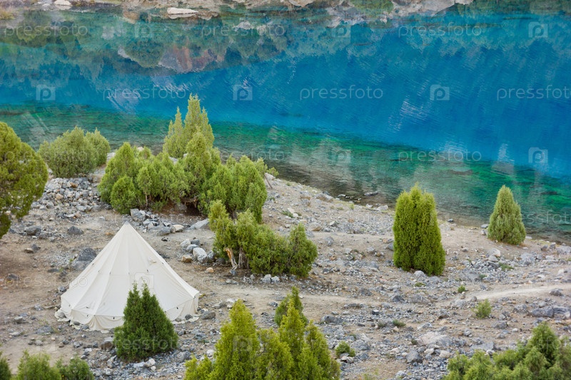 Белый шатер на берегу озера