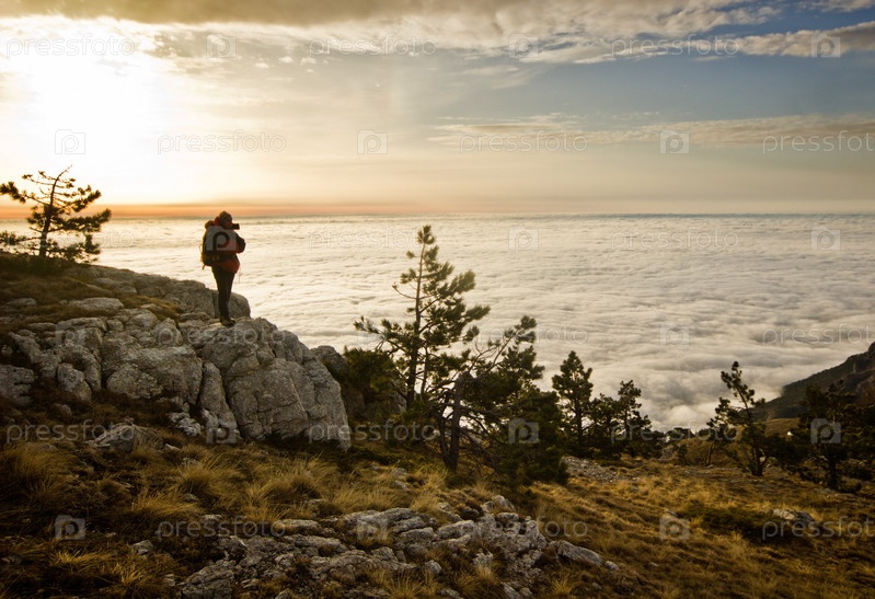 Девушка с рюкзаком стоит на горе