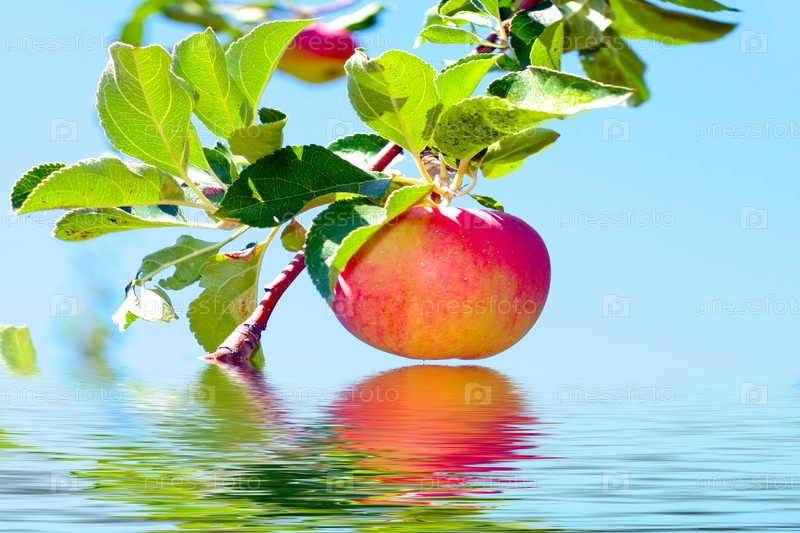 Спелые яблоки на ветке и вода