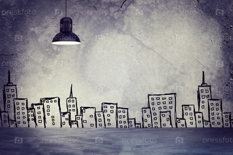 Бетонная стена с эскизами зданий