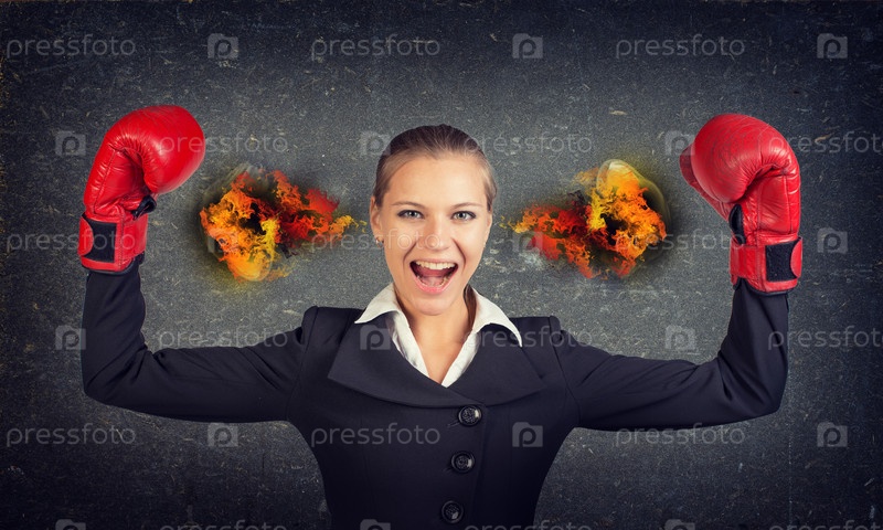 Женщина в красных боксерских перчатках с огнем из ушей