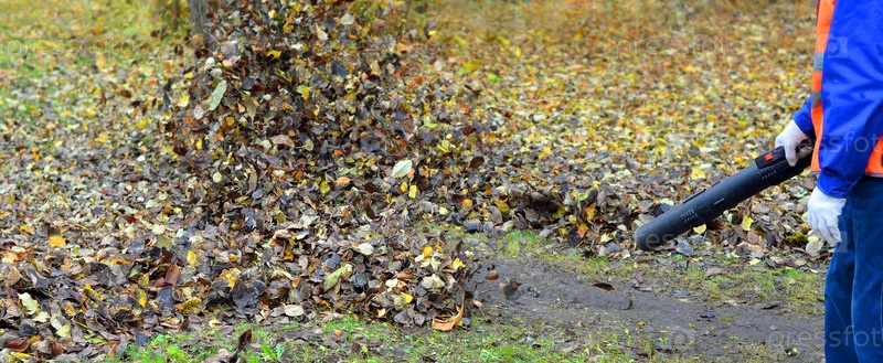 Работник сдувает опавшие листья
