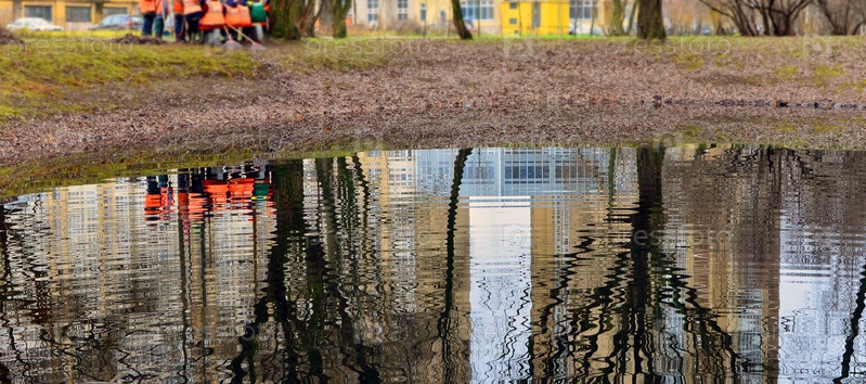 Рабочие убирают листья на берегу пруда