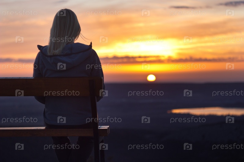 Девушка сидит на скамейке на закате