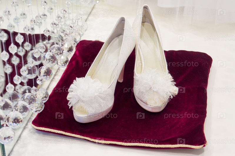 Белые свадебные туфли на красной подушке