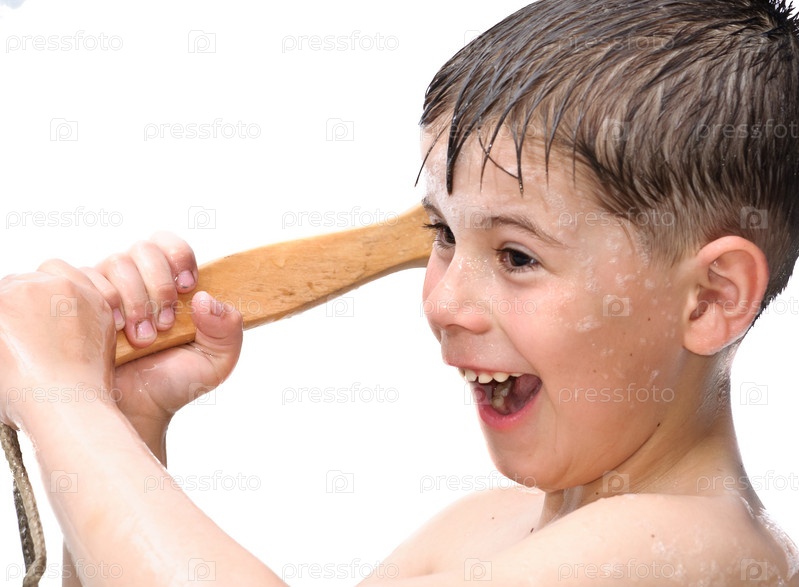 Мокрый мальчик с деревянной щеткой для тела