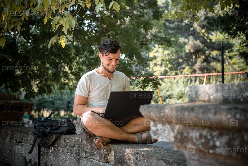 Стильный мужчина с ноутбуком на улице