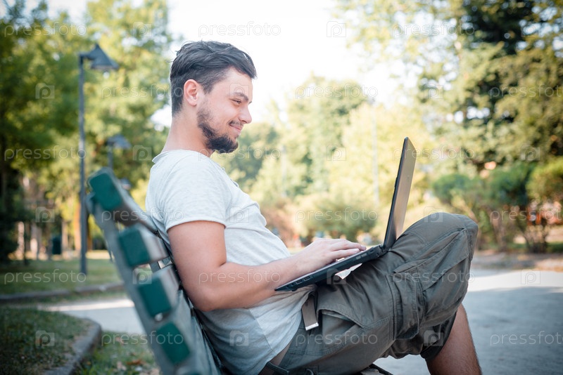 Стильный мужчина с ноутбуком на улице