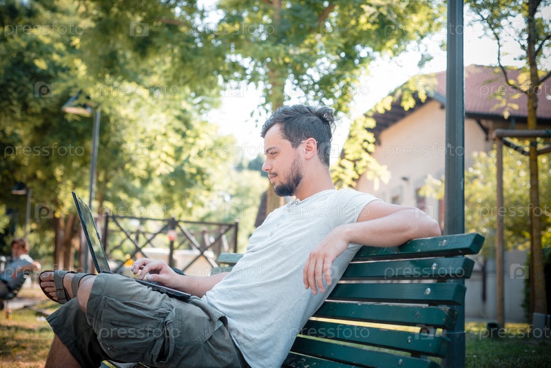 Стильный мужчина с ноутбуком на улице