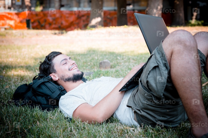 Стильный мужчина с ноутбуком на улице