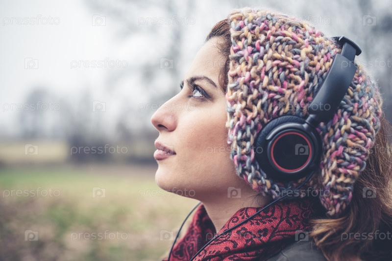 Красивая женщина слушает музыку в наушниках