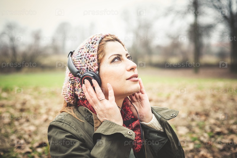 Красивая женщина слушает музыку в наушниках