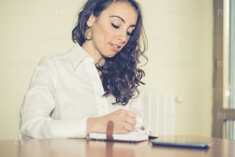 Красивая женщина что-то пишет в блокноте