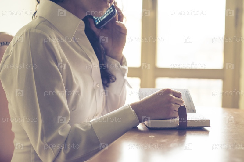 Красивая женщина что-то пишет в блокноте