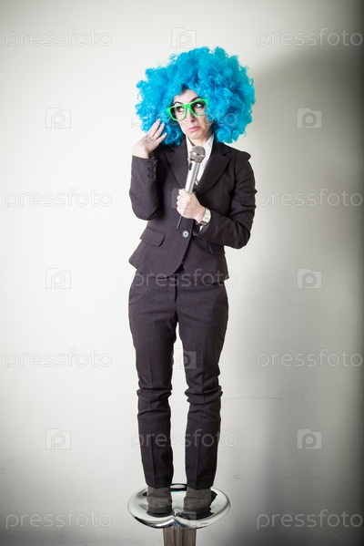 Смешная женщина в синем парике