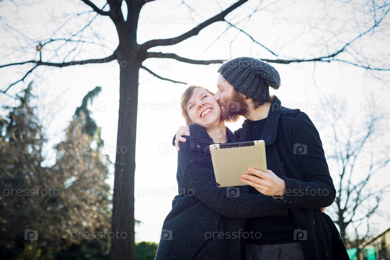 Молодая пара с планшетом на улице