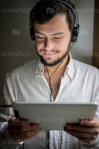 Мужчина с планшетом в наушниках