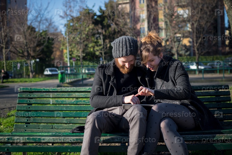 Молодая пара с планшетом на улице