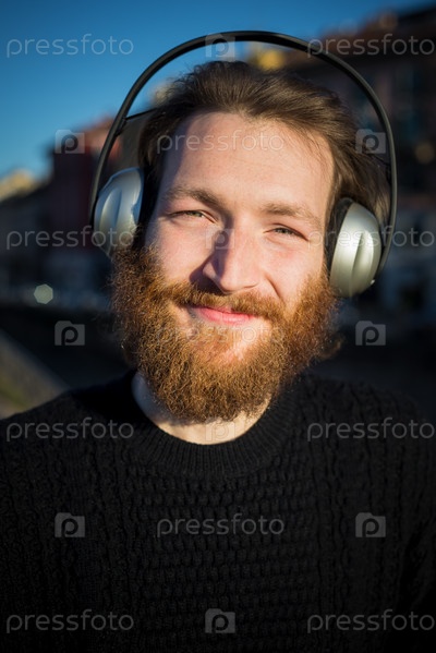Стильный молодой бородатый мужчина в наушниках