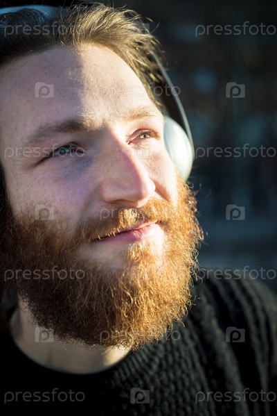 Стильный молодой бородатый мужчина в наушниках