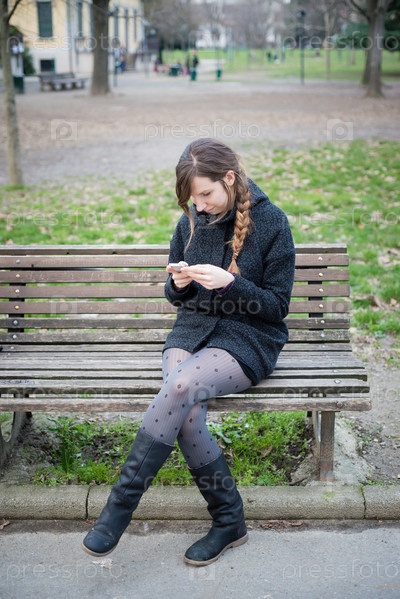 Женщина с телефоном на скамейке