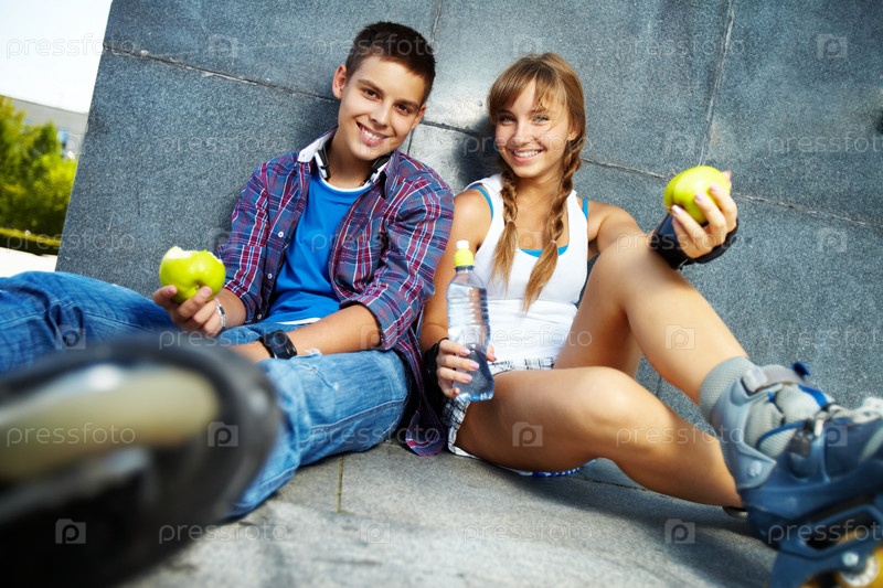 Подростки на роликах с яблоками