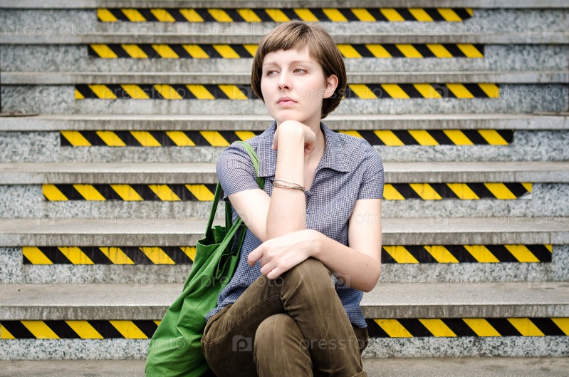 Женщина сидит на лестнице