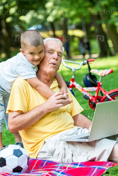 Пожилой мужчина и мальчик с ноутбуком