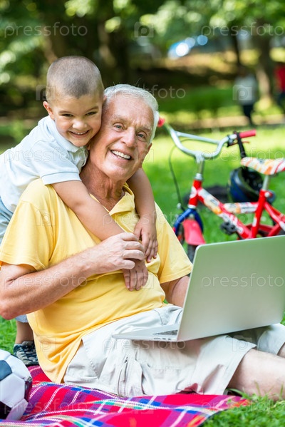 Пожилой мужчина и мальчик с ноутбуком