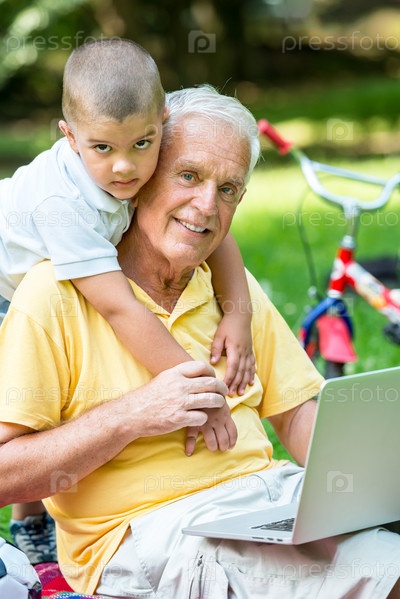 Пожилой мужчина и мальчик с ноутбуком