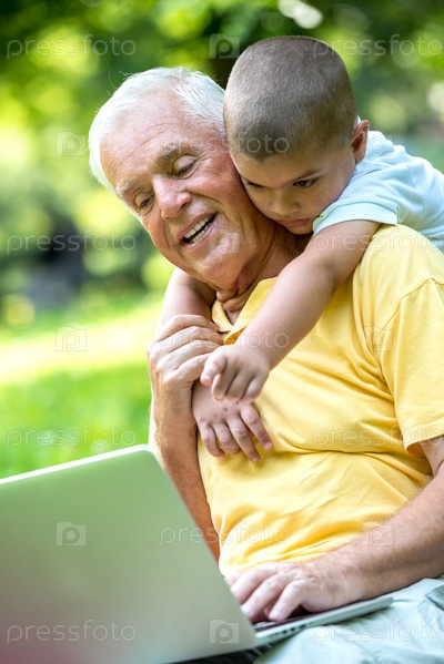 Пожилой мужчина и мальчик с ноутбуком