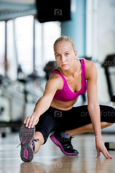 Женщина делает растяжку в тренажерном зале