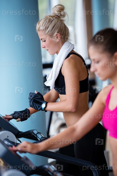Девушки занимаются на беговых дорожках в тренажерном зале