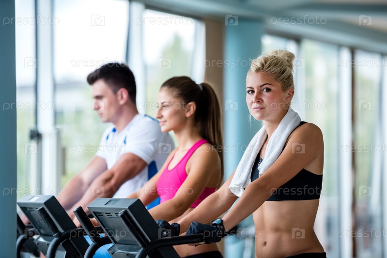Люди занимаются на беговых дорожках в тренажерном зале