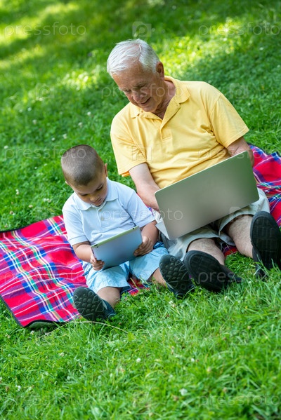 Пожилой мужчина и мальчик с ноутбуком