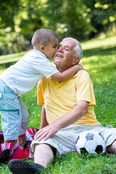 Пожилой мужчина с внуком отдыхает в парке