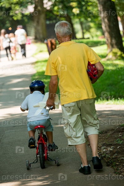 Пожилой мужчина с внуком отдыхает в парке