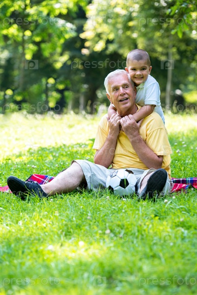 Пожилой мужчина с внуком отдыхает в парке