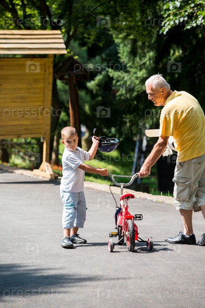 Пожилой мужчина с внуком отдыхает в парке