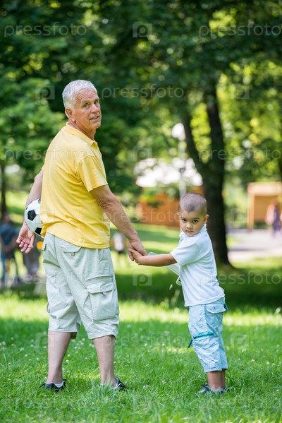 Пожилой мужчина с внуком отдыхает в парке
