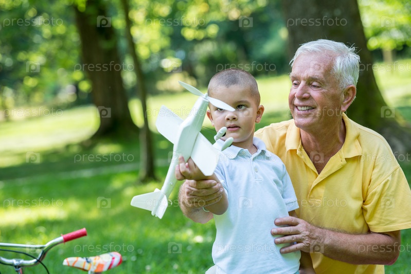 Пожилой мужчина с внуком отдыхает в парке