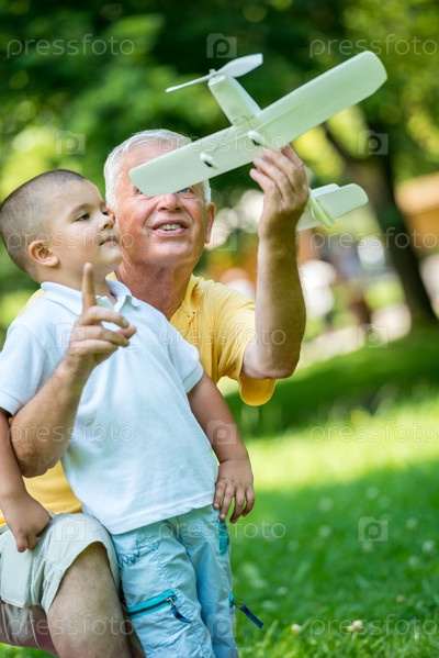 Пожилой мужчина с внуком отдыхает в парке
