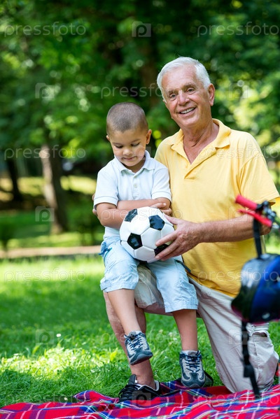 Пожилой мужчина с внуком отдыхает в парке