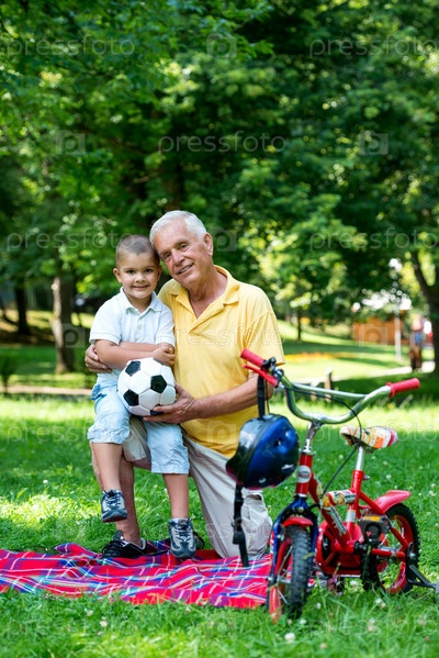 Пожилой мужчина с внуком отдыхает в парке