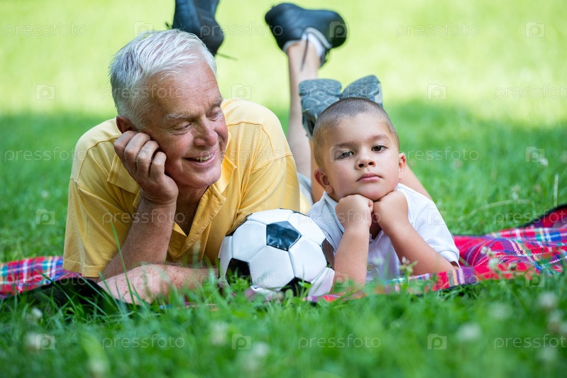 Пожилой мужчина с внуком отдыхает в парке
