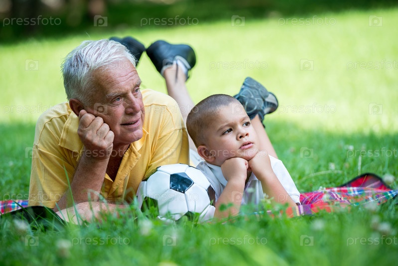 Пожилой мужчина с внуком отдыхает в парке