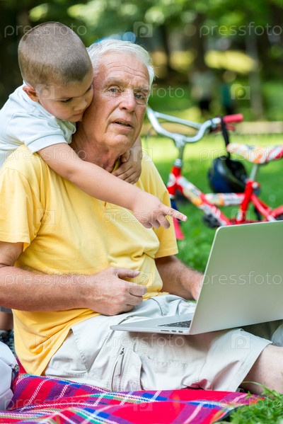 Пожилой мужчина и мальчик с ноутбуком