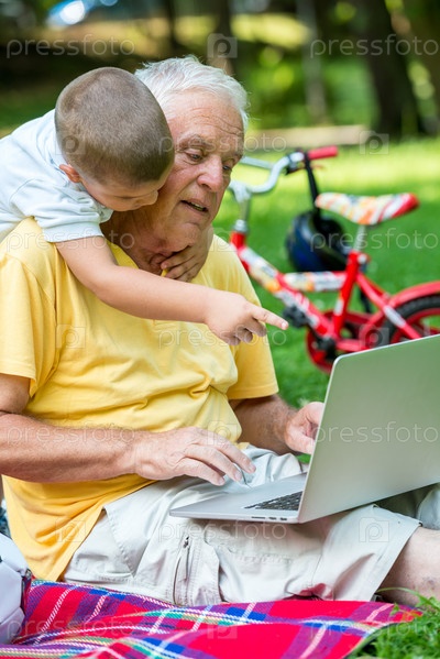 Пожилой мужчина и мальчик с ноутбуком